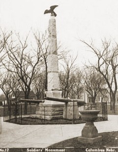 A contract was made with Kimball Brothers of Lincoln for the erection of the monument, which is 30 feet high. The heaviest stone weighs about 16,000 pounds, and is 9x9 feet; the die is 4 feet square and 4 1/2 high, and on it are cut 132 names. The stone column is surmounted by bronze eagle with a spread of 6 feet; the two cannon with the muzzles pointing south, are placed on pedestals, one of the east, the other of the west of the column--these pedestals 3 feet square and 4 feet high.