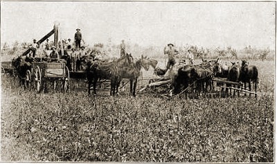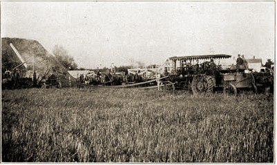 Nowadays one of those big modern steam outfits comes into a farmer's yard at twenty miles an hour, whistles, stops, backs up a few feet, lets off a hundred pounds of steam, and then the chief mogul yells for wheat or oats. The big belt begins to turn, men drive up and throw wagon loads of bundles into the big "Quintus" self-feeder and band cutter, there is a puff of smoke, a hum of wheels, a steady stream of straw onto the stack through the blow stacker, a column of grain flies through the weigher, and before the farmer's wife (who is exceedingly wrathy because the elegant dinner she had prepared is to go untouched) has time to ring the bell, the army is off up the road and ready to tackle the big job at Jones, where the women folks were not expecting them for a half day at least, and are thrown into a panic by the prospect of feeding thirty hungry men on fifteen minutes notice. At the end of a couple of weeks the threshing is done and the boys have a month's rest, take long breaths and enjoy life. And thus it goes. Every year the big machine works faster and faster, and every year the jobs grow shorter.